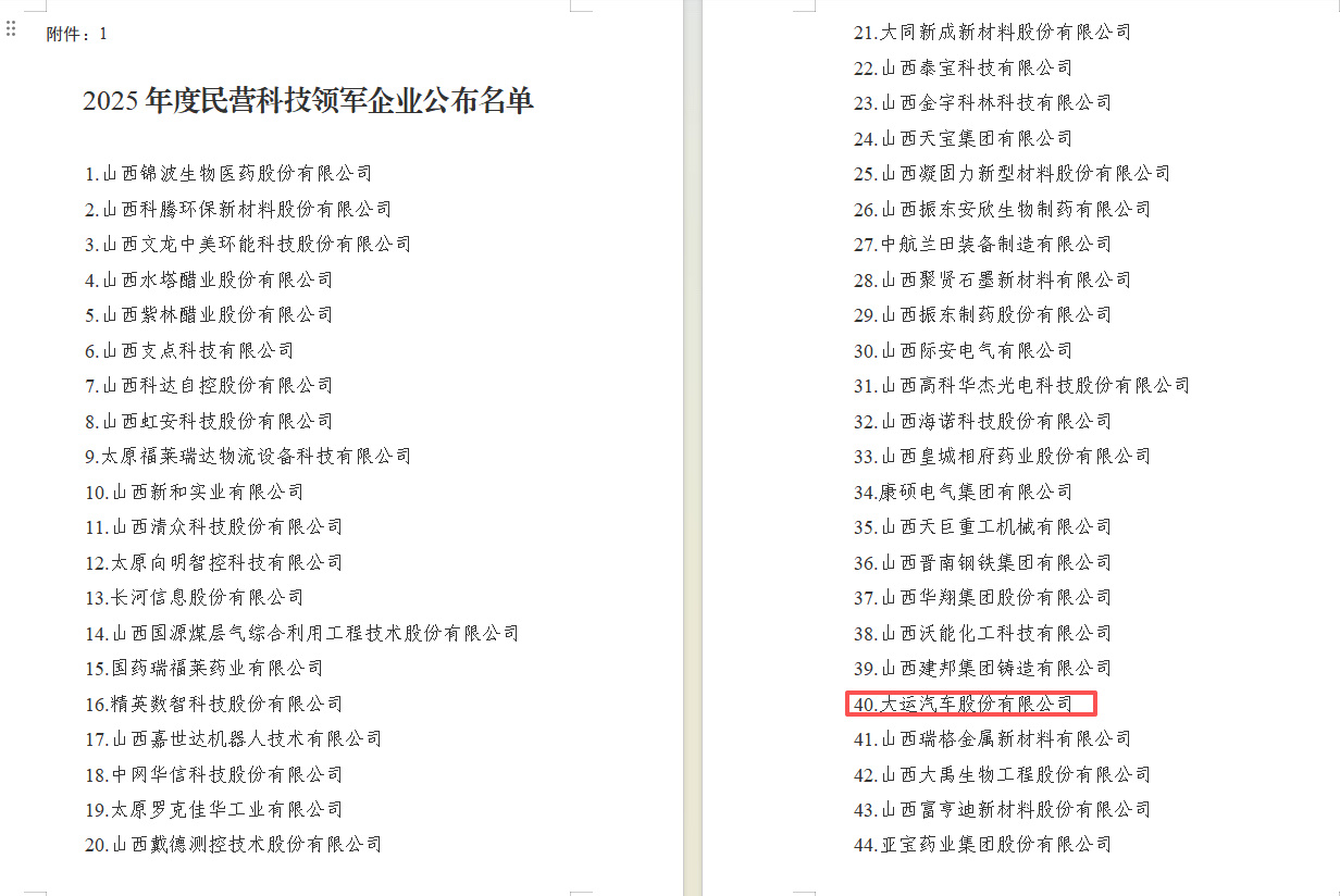 近日,省民营经济发展局公布了2025年度山西省民营科技领军、新锐企业名单,大运汽车股份有限公司凭借卓越的科技创新实力与行业引领地位,成功入选“2025年度民营科技领军企业”名单。